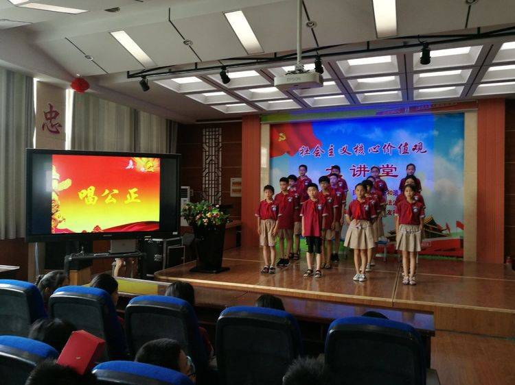 首先,有宁艳艳老师向大家阐述了公正,使孩子们明白了公正的基本含义。接着由学生合唱《公正歌》嘹亮的歌声与动作相融合,顿时拉近了公正与学生的距离。