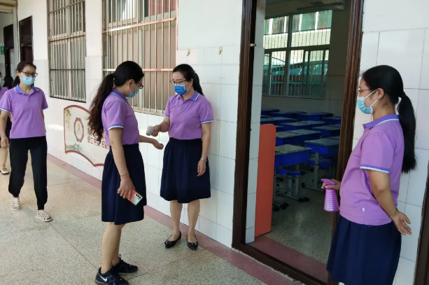 班主任老师和辅导老师在门口对学生进行测温、消毒,消毒完成后学生方可入班。上课期间,学生保持间距,佩戴口罩。