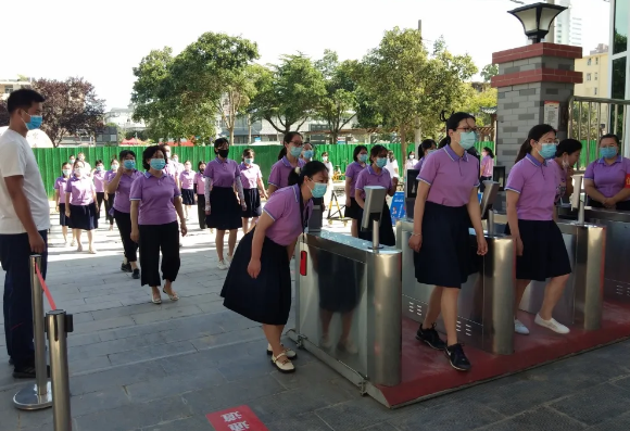 我校实行错时、错峰入校。学生入校时在东、西两边站成两列路队,分别有两名值周老师进行酒精消毒,同时检查学生是否佩戴口罩。消毒后通过闸机刷脸测温,有两名值班领导站在闸机口检查入校学生是否体温正常。学校根据班级分布分成四个入口进班,学生根据班级位置选择入口进班。