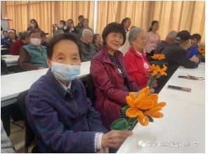 在活动接近尾声时,党员教师和志愿者向秋冬社区的老党员们献上亲手制作的学校吉祥物向阳花,希望以此表达向阳师生最真诚的重阳节祝福。
