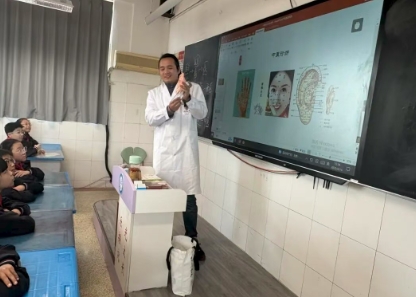 课堂上,张医生通过图文并茂的课件,以“神农尝百草”“扁鹊望闻问切”等故事为引,生动讲解中医发展简史与核心理念。结合小学生日常健康需求,他重点科普了人体经络、穴位按摩、节气养生、常见的中药等实用知识,并带领学生现场体验“找找穴位”“观察中医治疗工具”等互动环节。